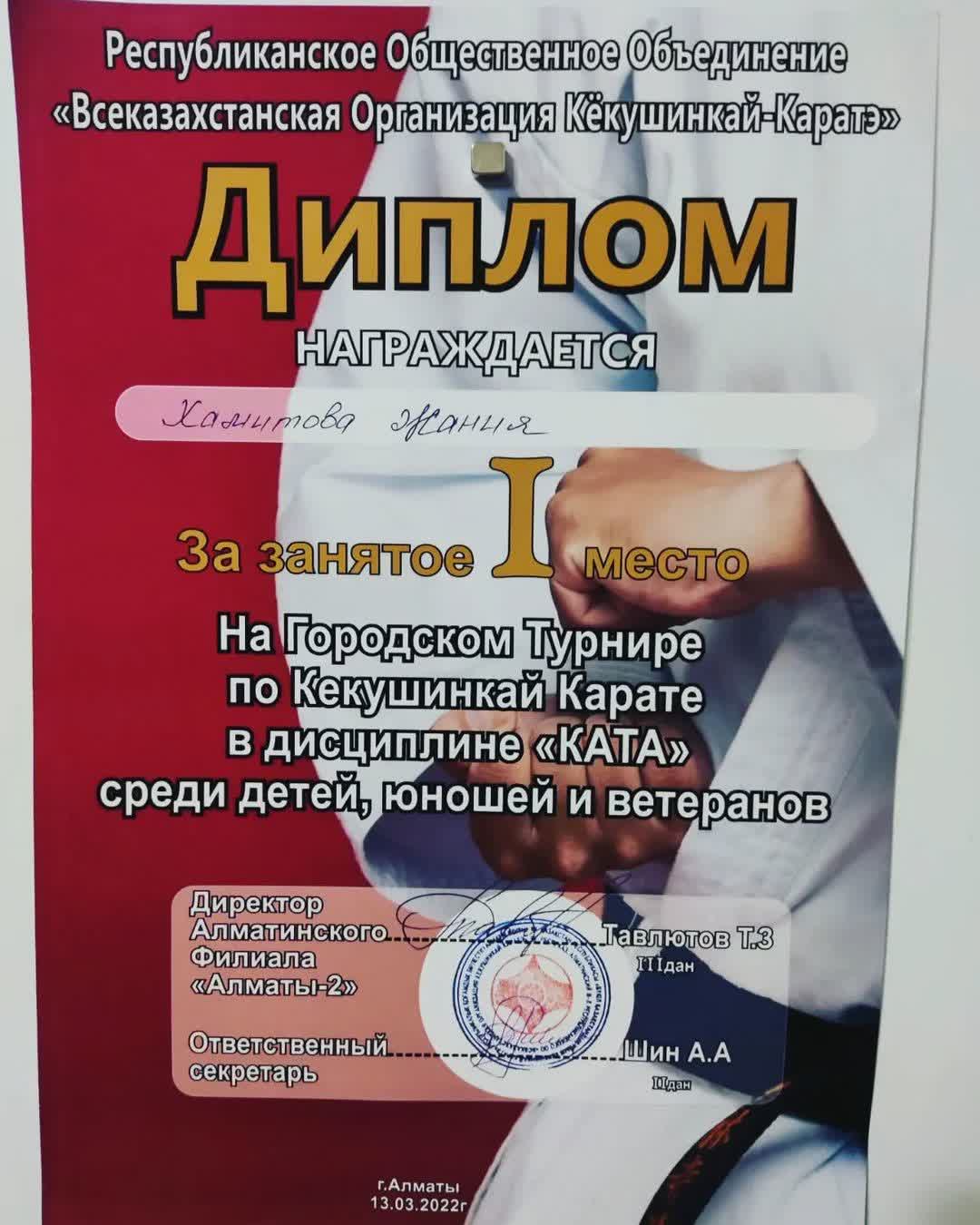 Алматы қаласындағы «Бүкіл Қазақстандық Кёкушенкай-Каратэ» қоғамдастығының ұйымдастыруымен Кекушинкай Карате сайысынан жасөспірімдер мен жастар арасындағы чемпионатқа «Л.Н.Толстой атындағы орта мектебі» Education Department of Kerbulak districtнің 5 «А» сынып оқушысы Хамитова Жания қатысып, 1-ші орын алып, Алтын медаль және дипломмен марапатталды! 🥇