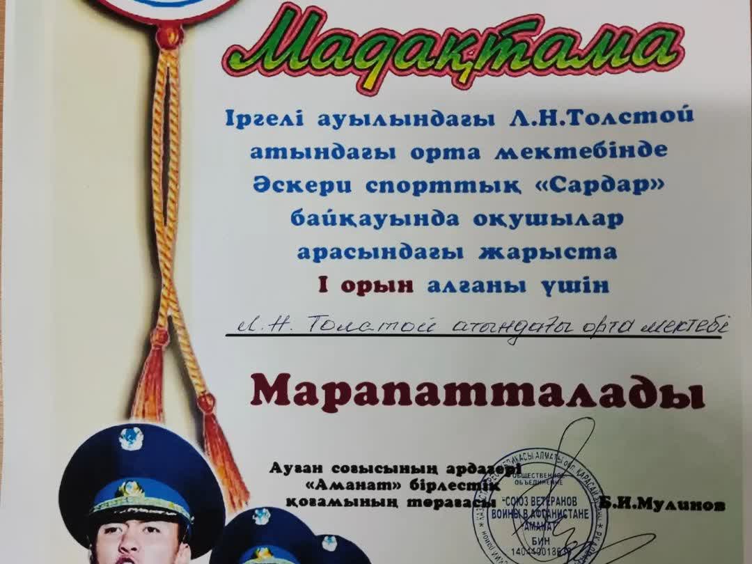 Ауған соғысының ардагерлері және «Аманат» бірлестігі қоғамының ұйымдастыруымен Іргелі ауылындағы «Л.Н.Толстой атындағы орта мектебі» Education Department of Kerbulak districtнде Әскери спорттық «Сардар» атты оқушылар арасында байқау өтті. Байқауға мектебіміздің 10-11 сынып оқушылары қатысып, 1-орынды иеленді!