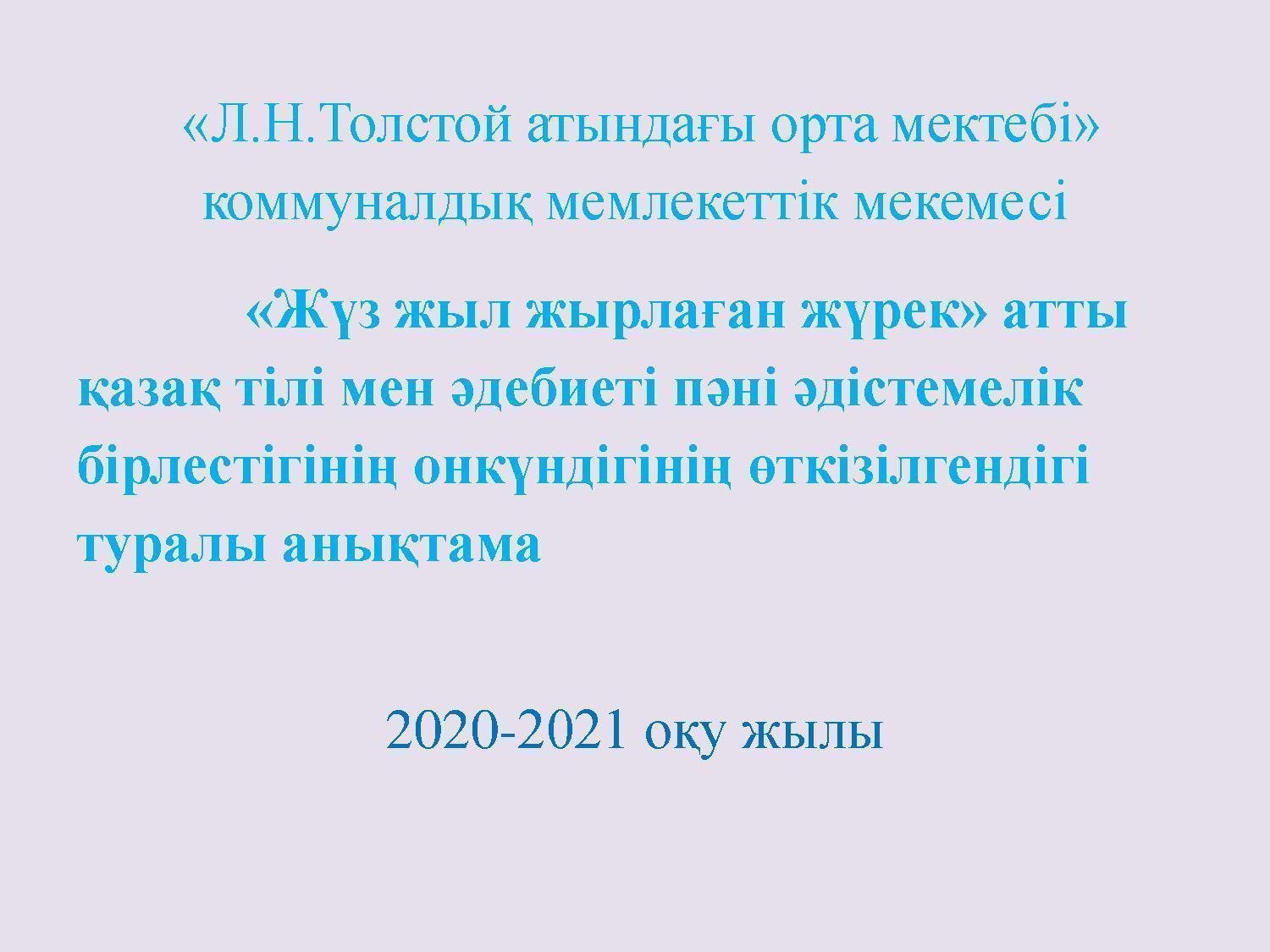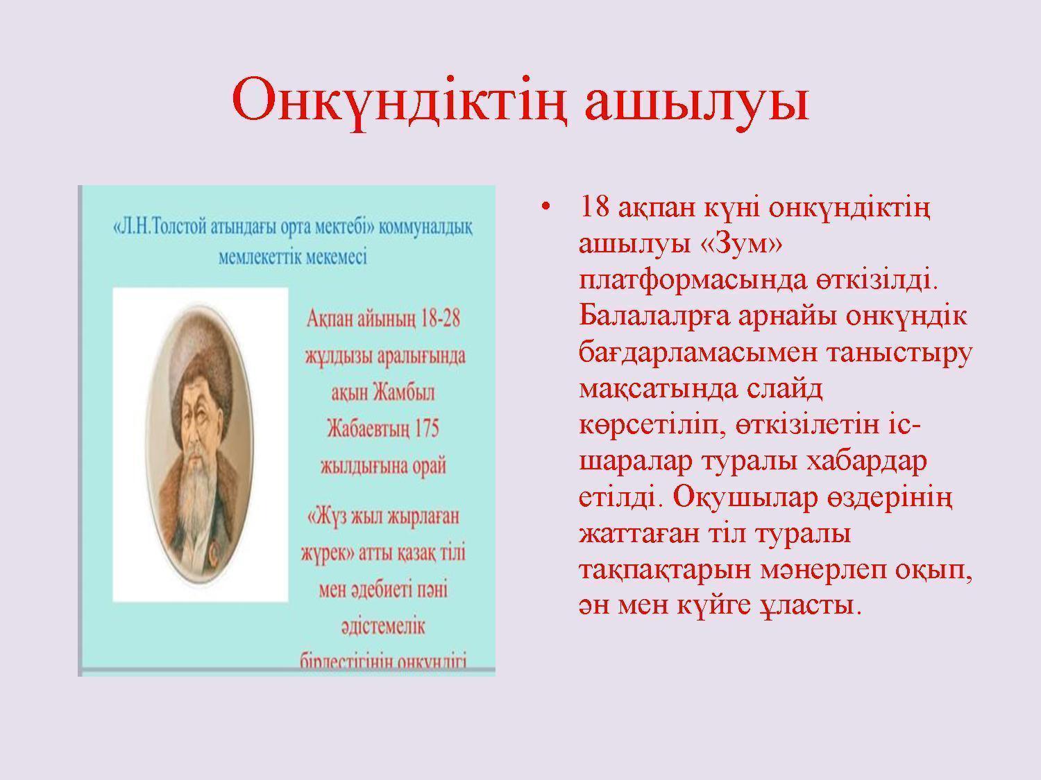 «Л.Н.Толстой атындағы орта мектебі» коммуналдық мемлекеттік мекемесі «Жүз жыл жырлаған жүрек» атты қазақ тілі мен әдебиеті пәні әдістемелік бірлестігінің онкүндігінің аяқталуы. » Лев Николаевич Толстой атындағы орта мектеп