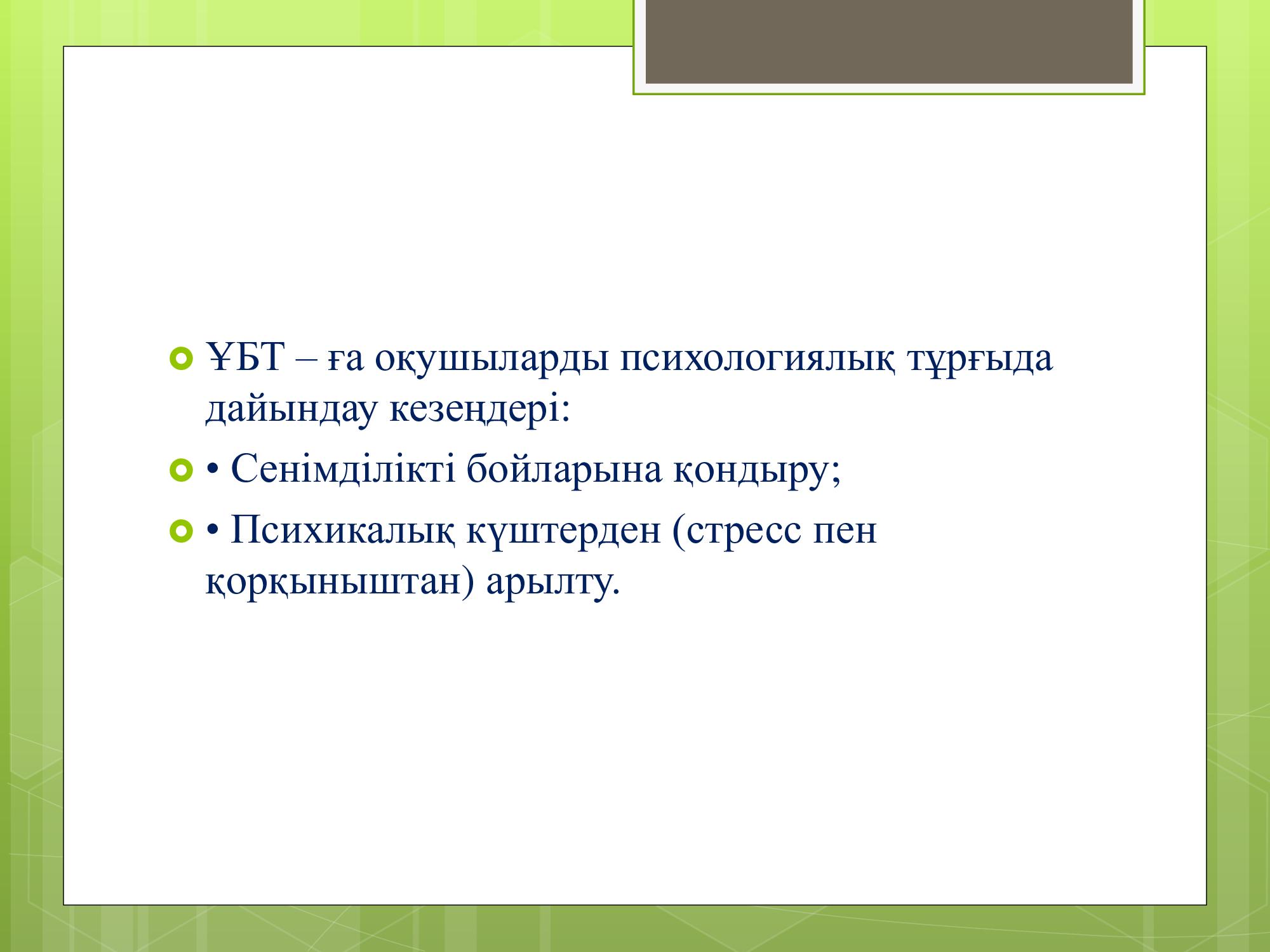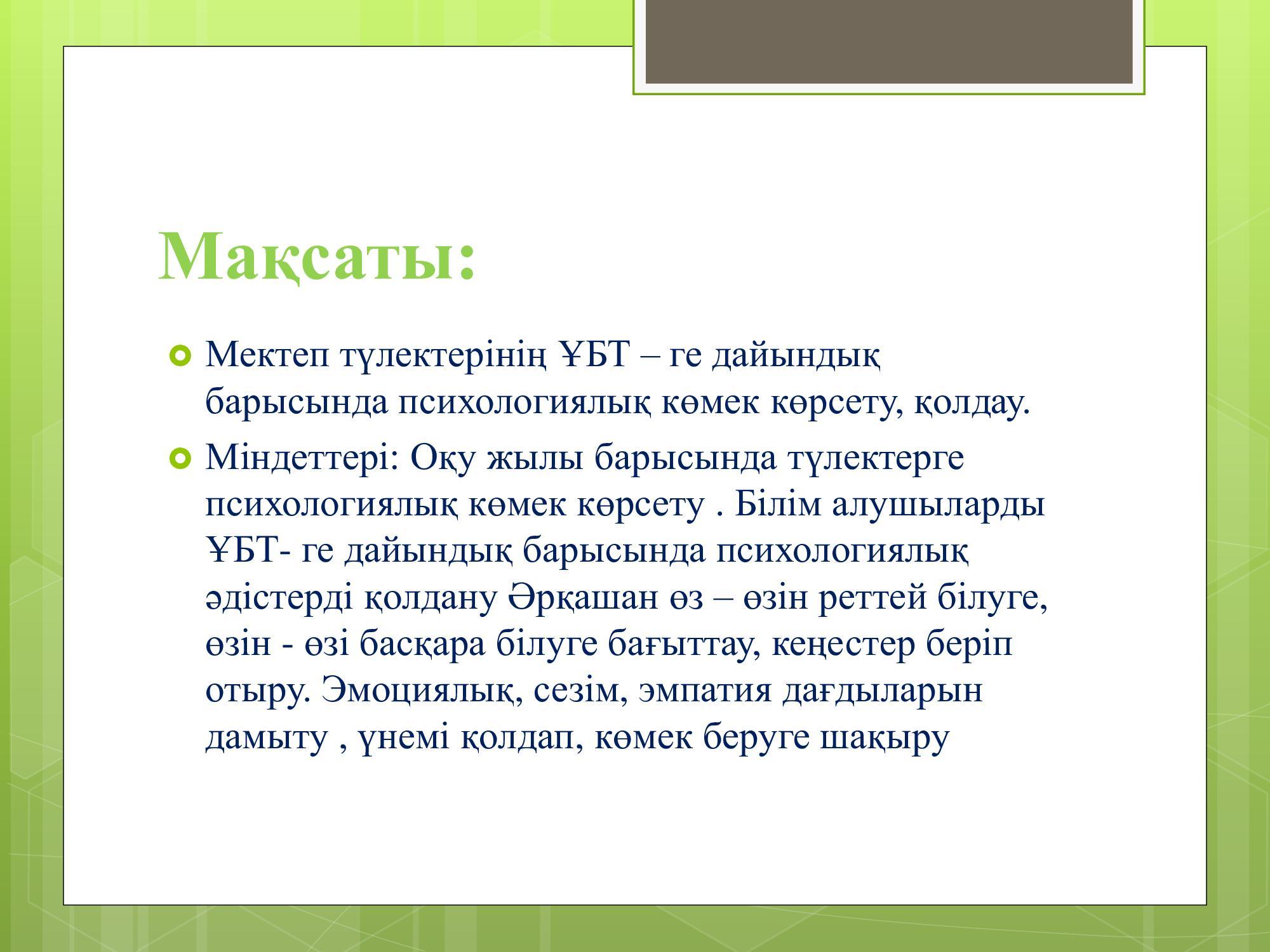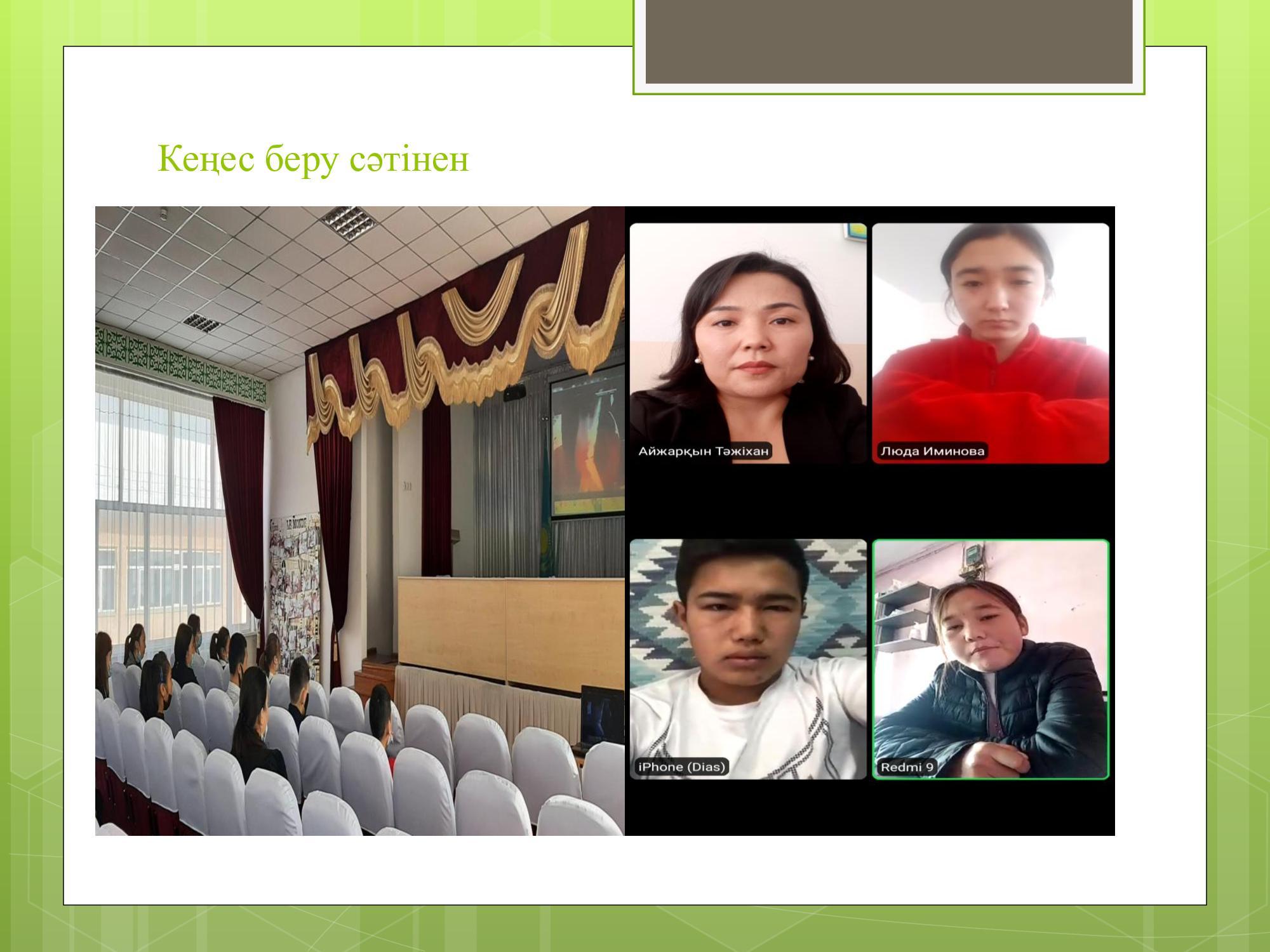 11-сынып оқушыларына жүргізілген онлайн, офлайн жұмыстары кезінде оқушыларға "Стресс тесті" жүргізілді. Қорытындысы бойынша балаларға "Стрессті қалай жеңуге болады" тақырыбында психологиялық кеңестер берілді.