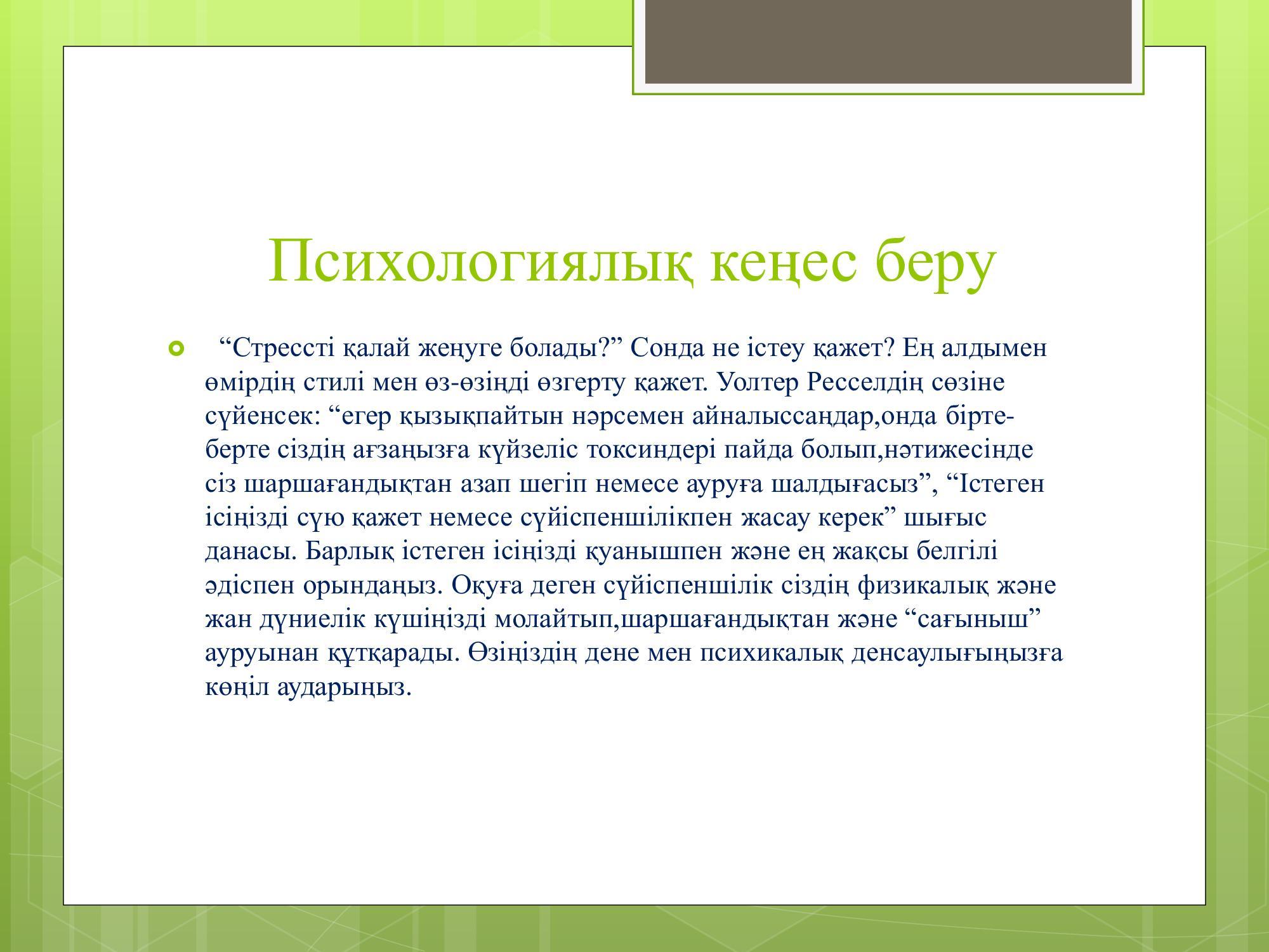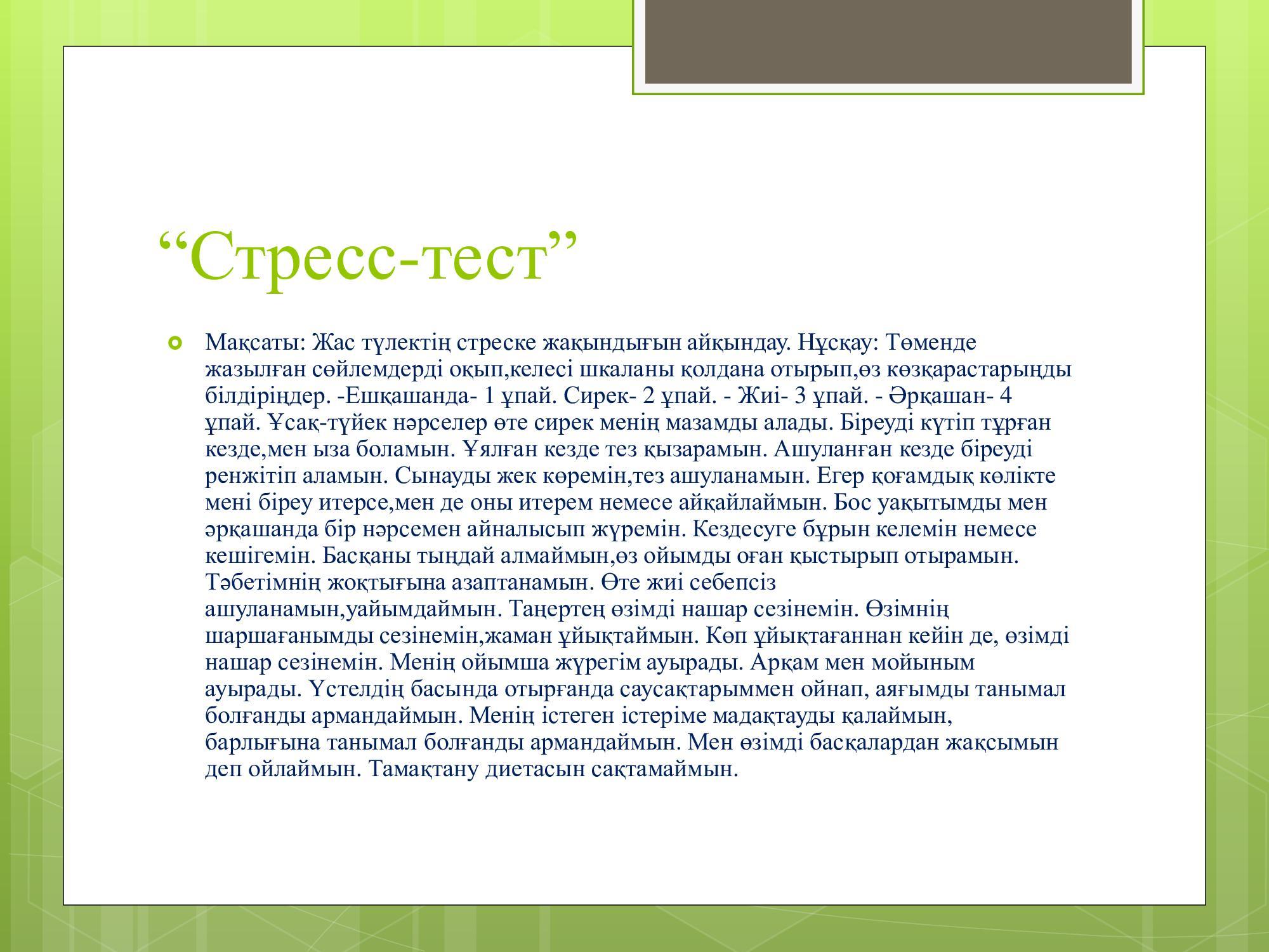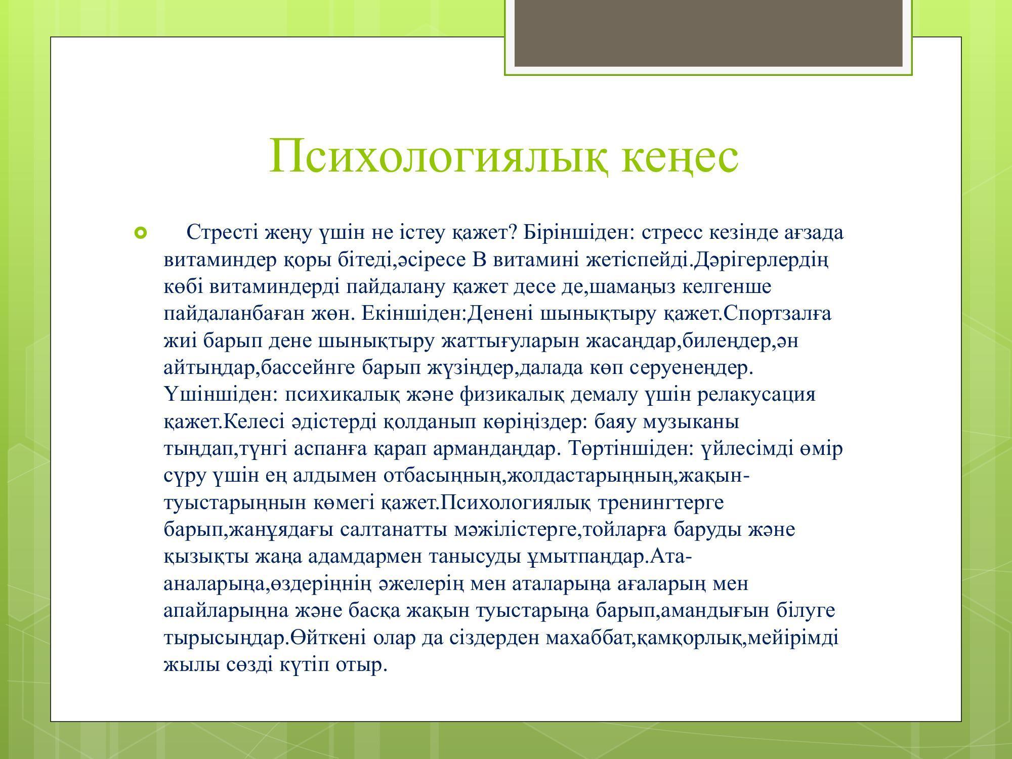 11-сынып оқушыларына жүргізілген онлайн, офлайн жұмыстары кезінде оқушыларға "Стресс тесті" жүргізілді. Қорытындысы бойынша балаларға "Стрессті қалай жеңуге болады" тақырыбында психологиялық кеңестер берілді. » Лев Николаевич Толстой атындағы орта мектеп