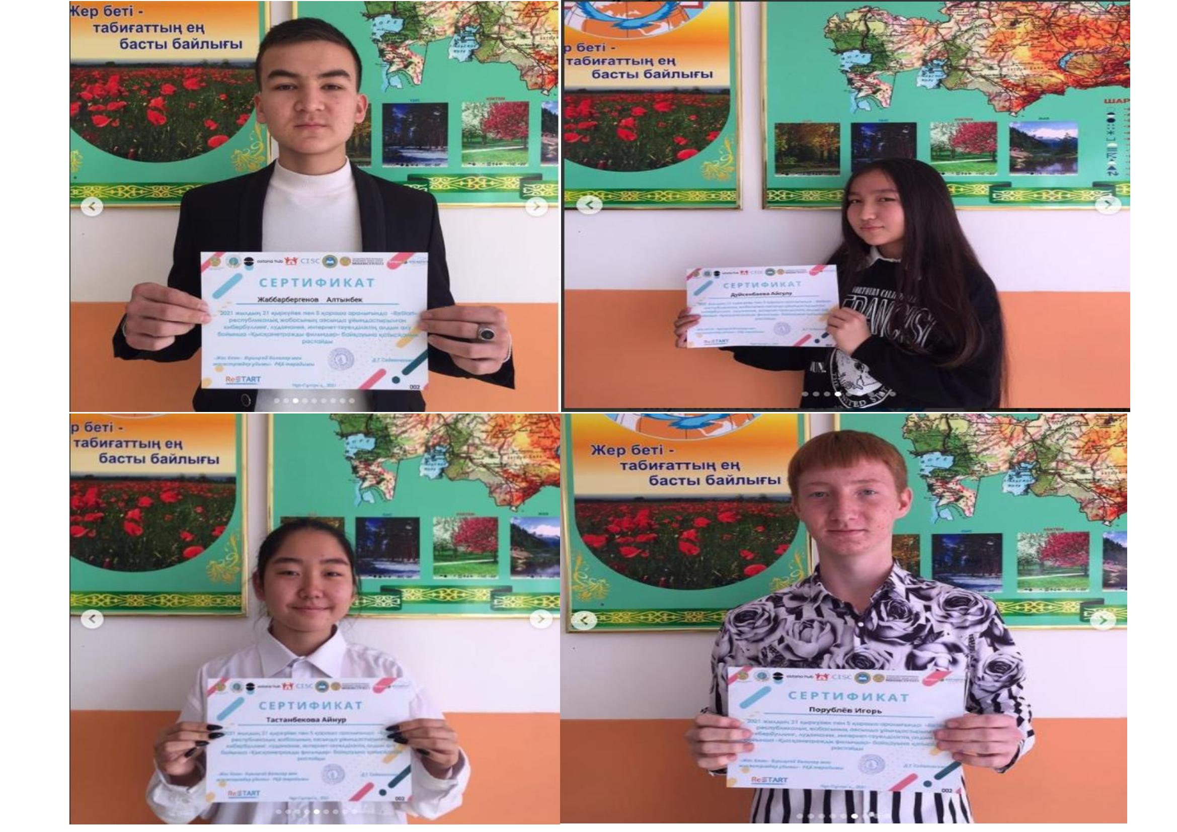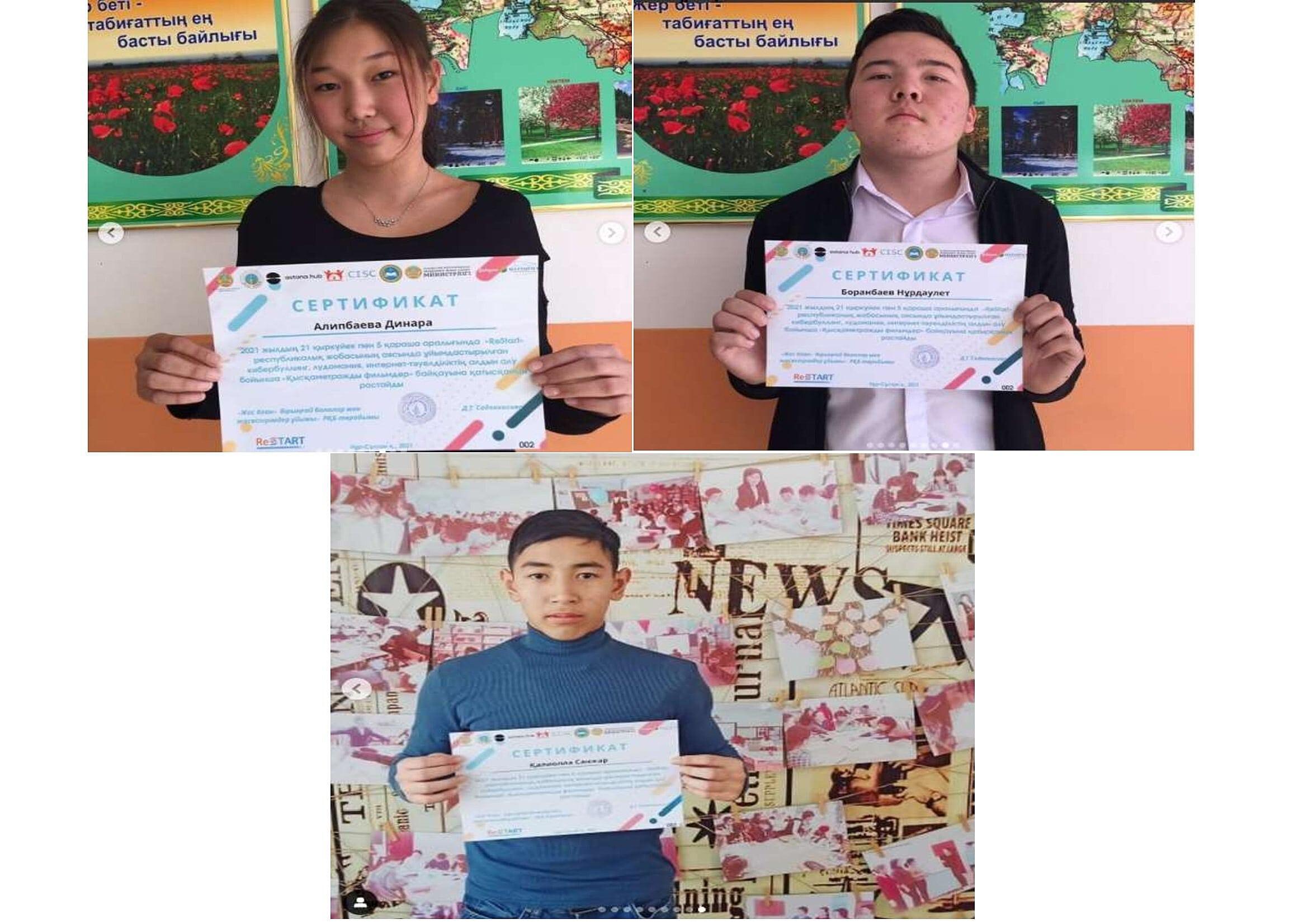 Мектебіміздің оқушылары 2021 жылдың 21 қыркүйек пен 5 қараша аралығында "ReStart" республикалық жобасының аясында ұйымдастырылған кибербуллинг, лудомания, интернетке тәуелділіктің алдын алу бойынша "Қысқаметражды фильмдер" байқауына қатысып, арнайы сертификаттармен марапатталды!