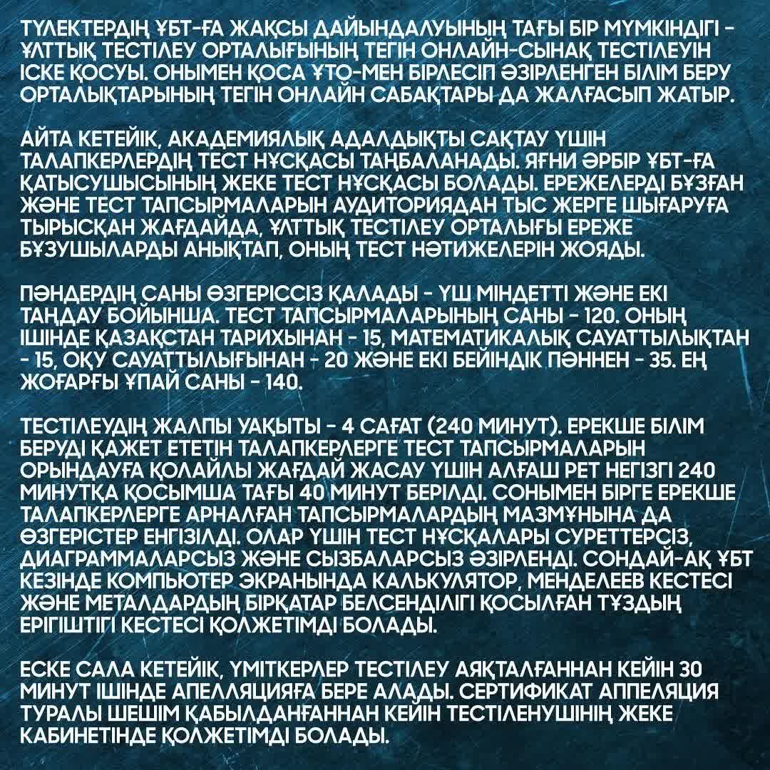 Түлектердің ҰБТ-ға жақсы дайындалуының тағы бір мүмкіндігі – Ұлттық тестілеу орталығының тегін онлайн-сынақ тестілеуін іске қосуы. Онымен қоса ҰТО-мен бірлесіп әзірленген білім беру орталықтарының тегін онлайн сабақтары да жалғасып жатыр.