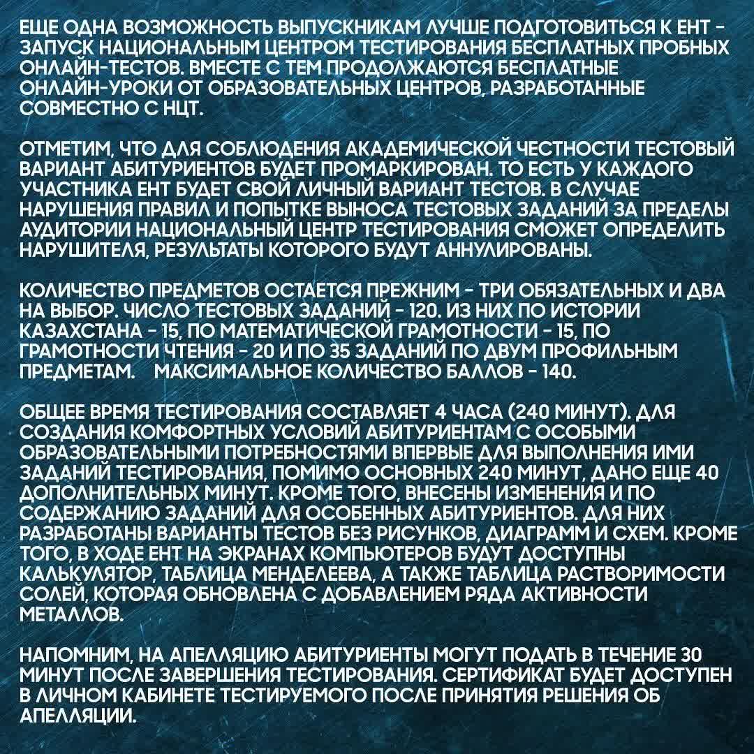 Количество предметов остается прежним, число тестовых заданий – 120. Из них по истории Казахстана – 15, по математической грамотности – 15, по грамотности чтения – 20 и по 35 заданий по двум профильным предметам. Максимальное количество баллов – 140.