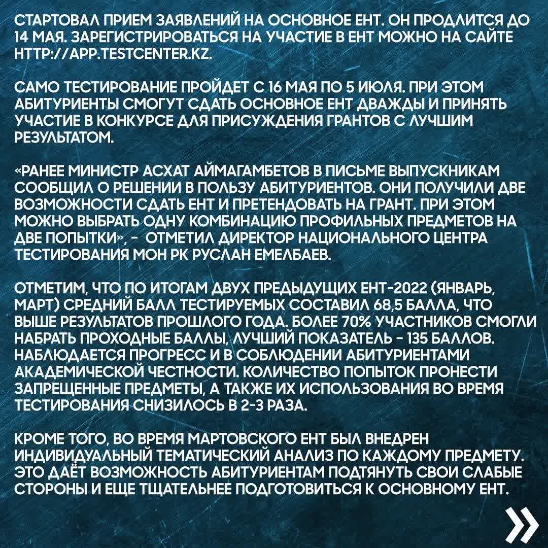 По итогам двух предыдущих ЕНТ-2022 (январь, март) средний балл тестируемых составил 68,5 балла, что выше результатов прошлого года. Более 70% участников смогли набрать проходные баллы, лучший показатель – 135 баллов.