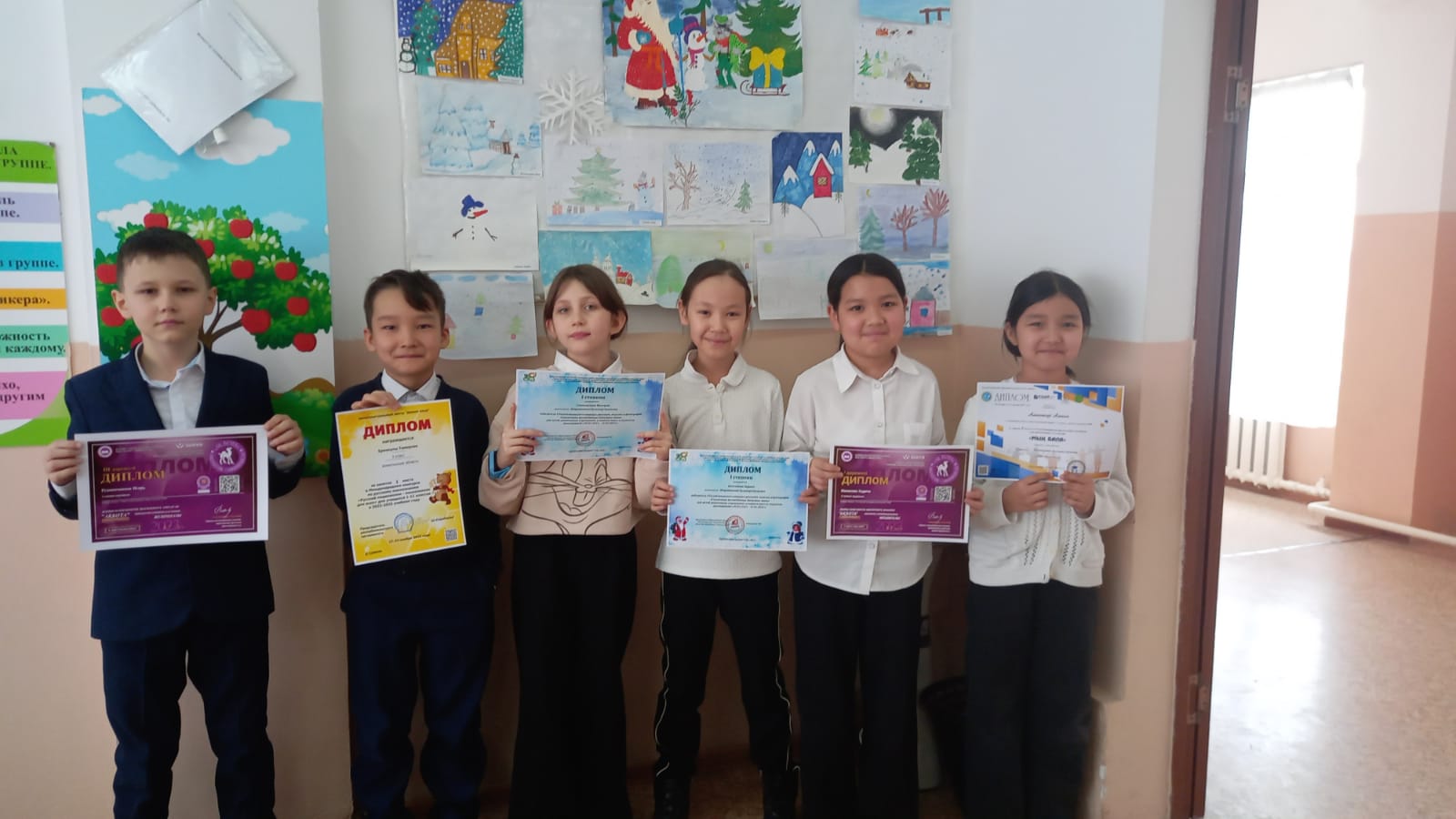 Ученики 3"В"класса Бектенова Зарина, Самохвалова Валерия заняли 1 место в Республиканском конкурсе рисунков " Сказочная волшебница Зимушка-зима".