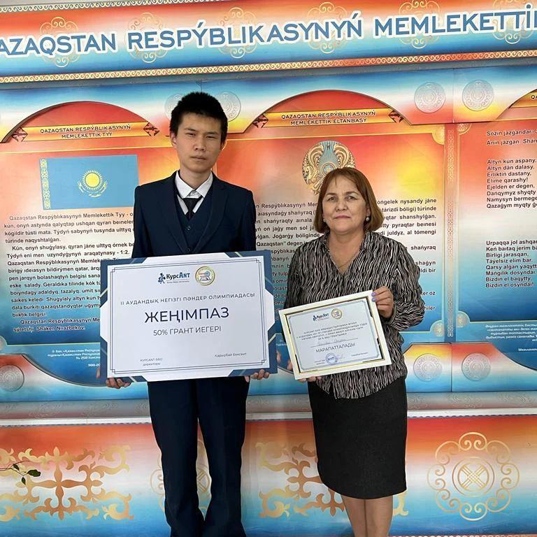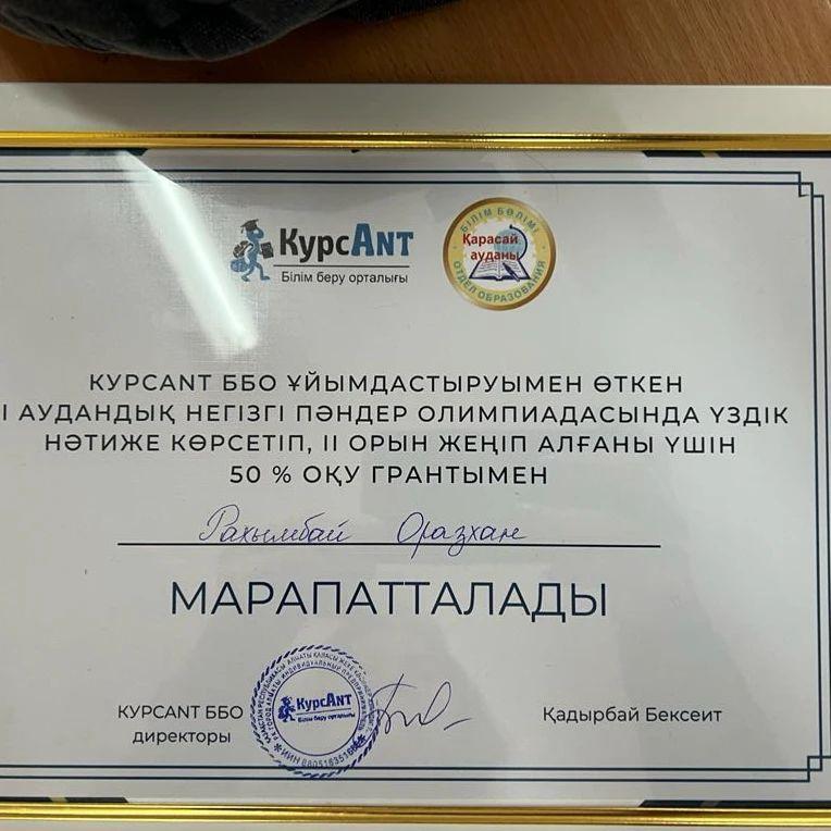 KурсAnt ББО ұйымдасытыруымен өткен II аудандық негізгі пәндер олимпиадасында үздік нәтиже көрсетіп, ,II орын жеңіп алғаны үшін 50% оқу грантын мектебіміздің 10 "Ә" сынып оқушысы Рахымбай Оразхан жеңіп алды.Шәкіртімізді шын жүректен құттықтаймыз