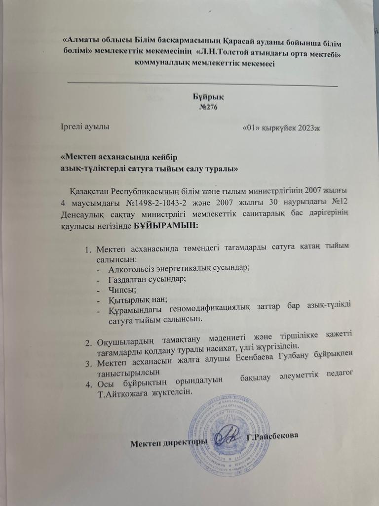 Мектеп асханасында кейбір азық-түліктерді сатуға тыйым салу туралы. » Лев Николаевич Толстой атындағы орта мектеп