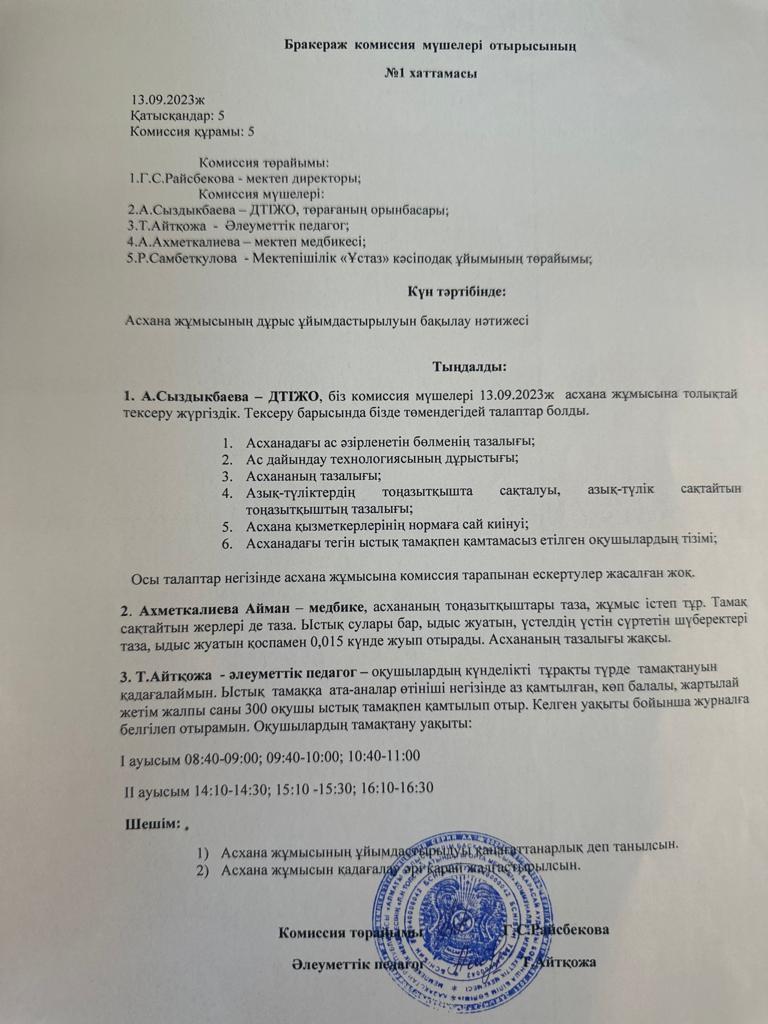 Ыстық тамақты тексеру туралы акті » Лев Николаевич Толстой атындағы орта мектеп