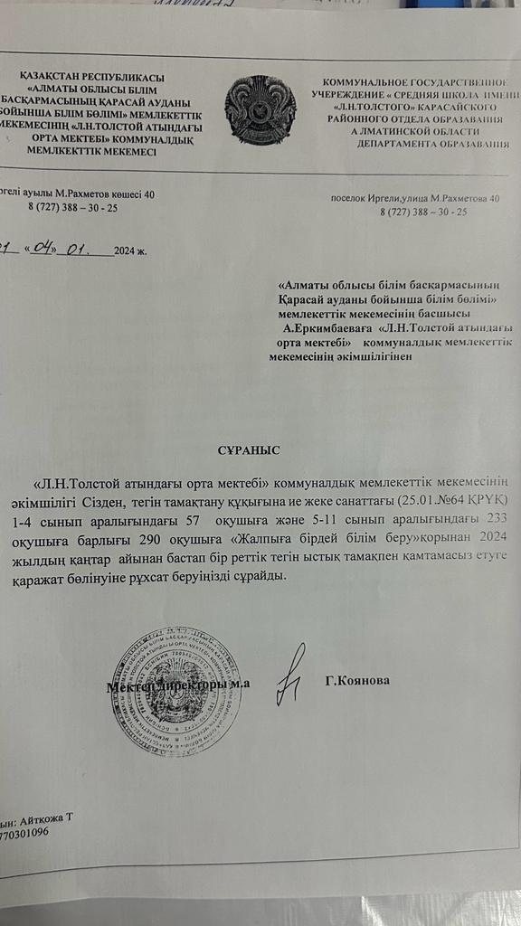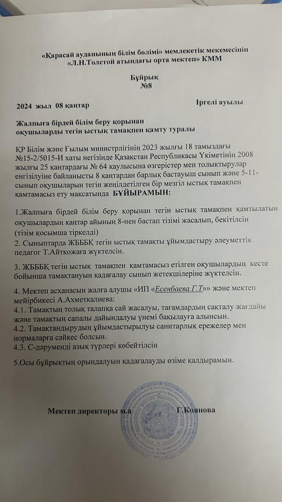 екінші жарты жылдықтағы оқушылардың ыстық тамақпен қамтылуы. » Лев Николаевич Толстой атындағы орта мектеп