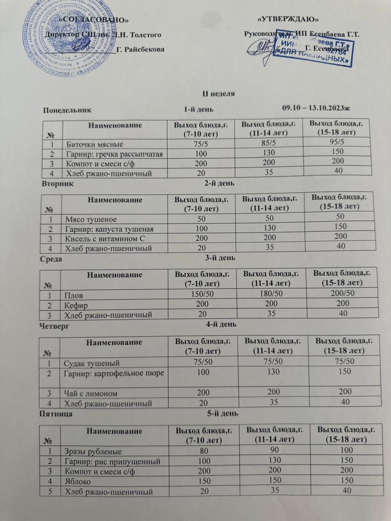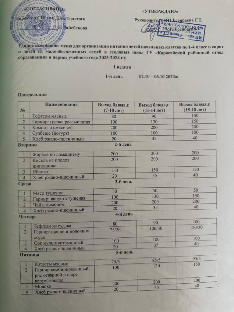 2023-2024 оқу жылындағы бекітілген ас мәзірі » Лев Николаевич Толстой атындағы орта мектеп