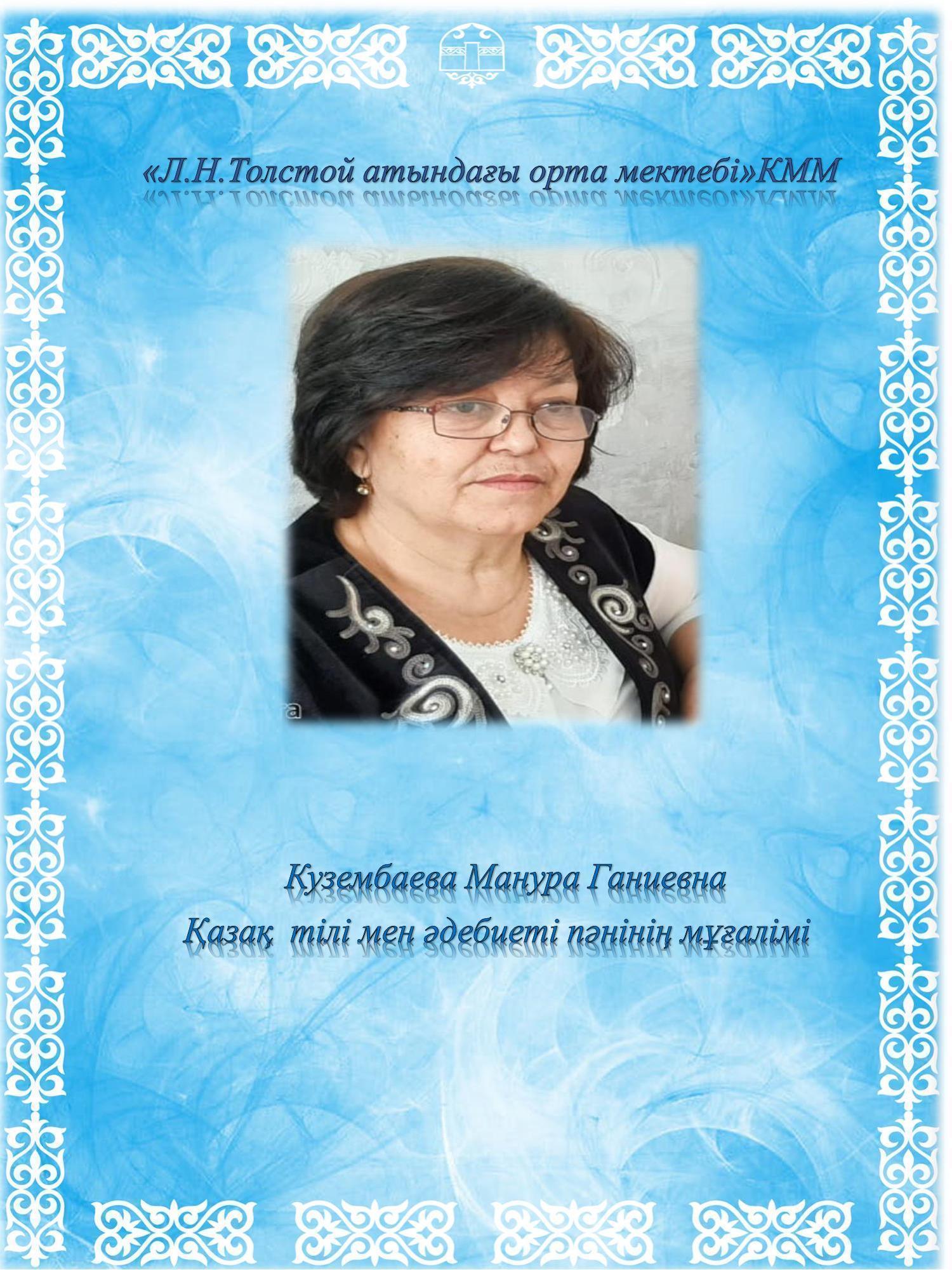 20 февраль 2021 0 1 2 3 4 5 Кузембаева Манура Ганиевна Кузембаева Манура ГаниевнаТуған күні,айы,жылы:17,05,1960 Алматы үздіксіз білім беру университеті. Қазақ тілі мен әдебиеті пәнінің мұғалімі.