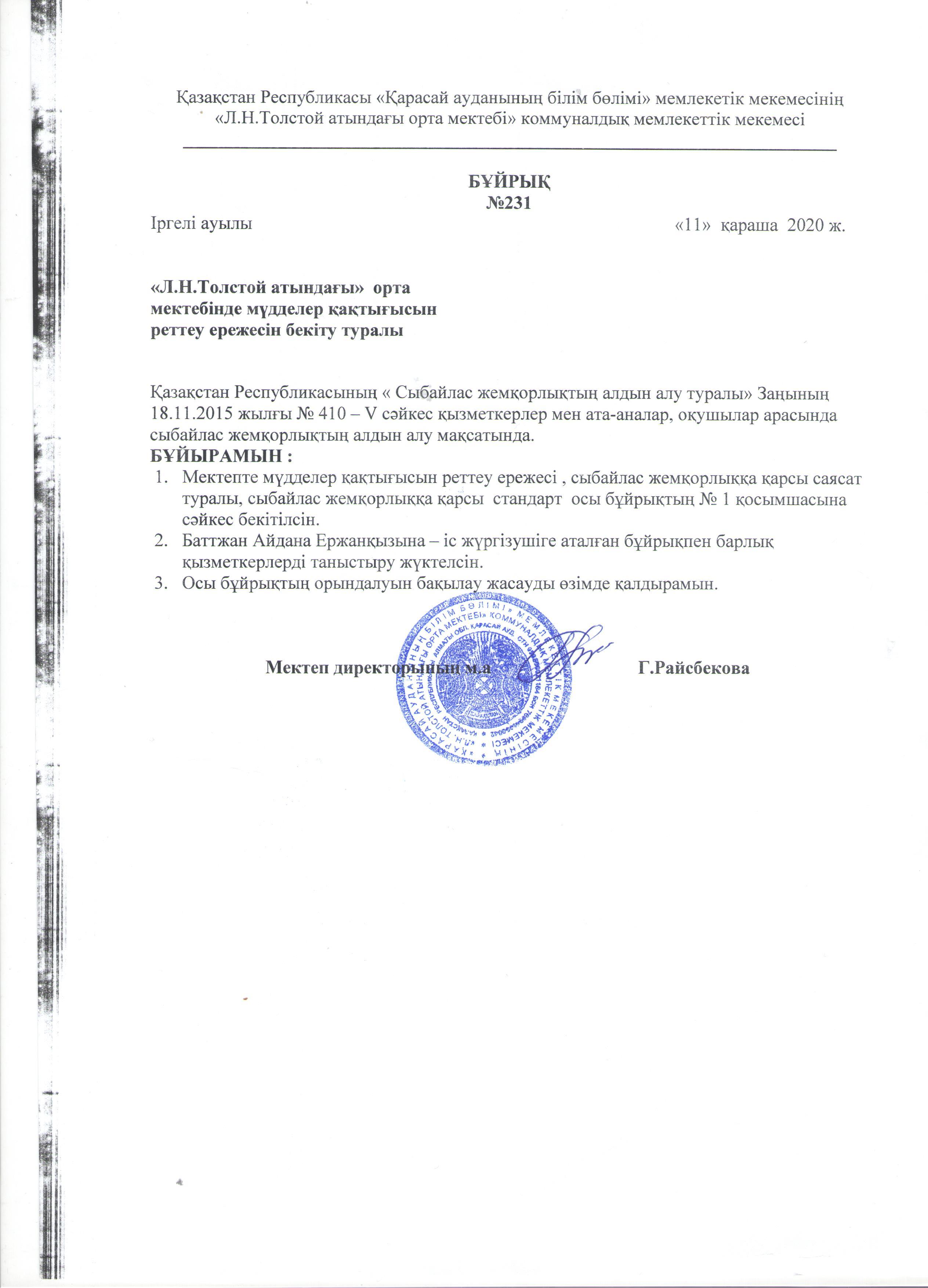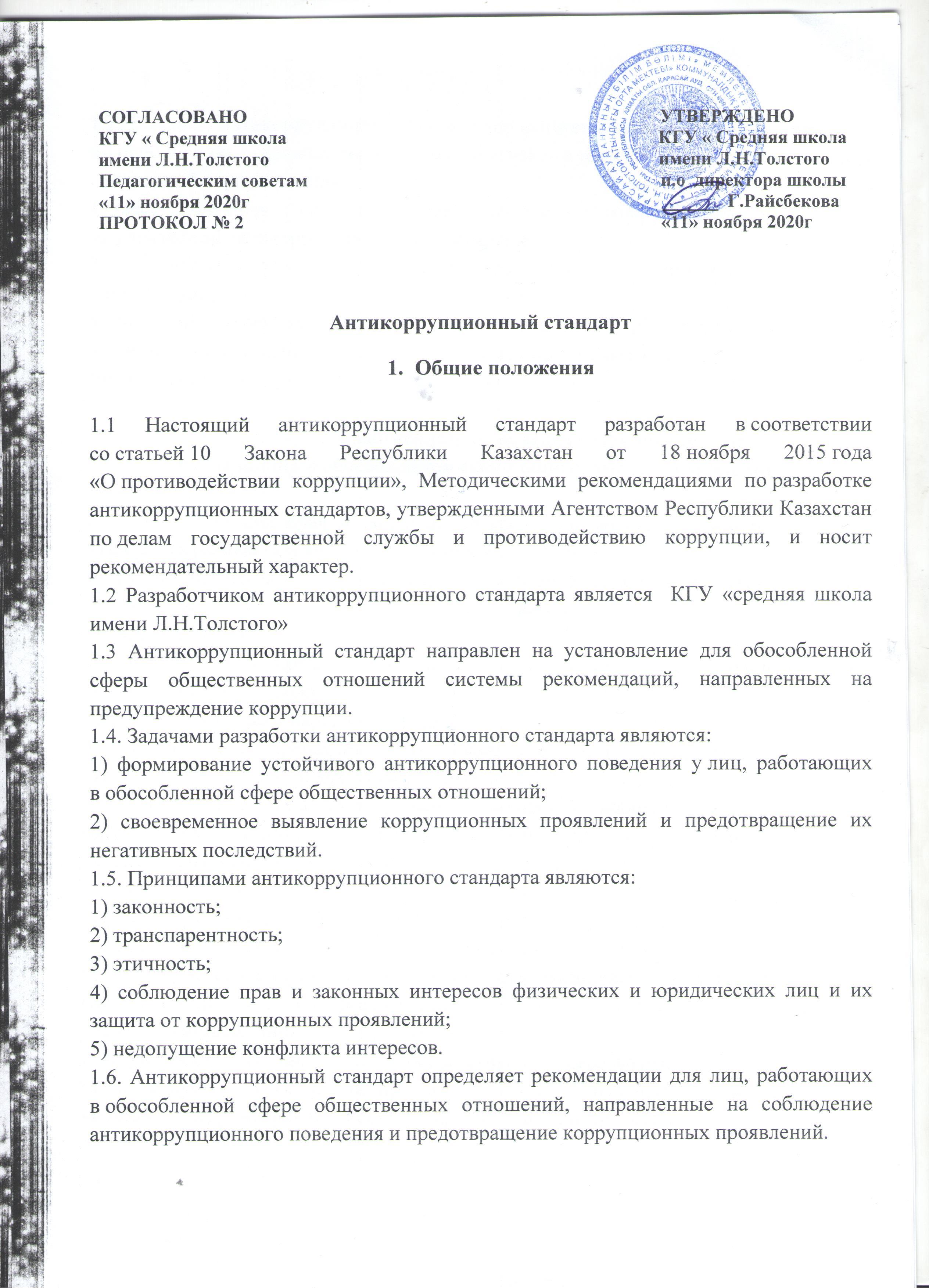Сыбайлас жемқорлыққа қарсы туралы ережелері. » Лев Николаевич Толстой атындағы орта мектеп