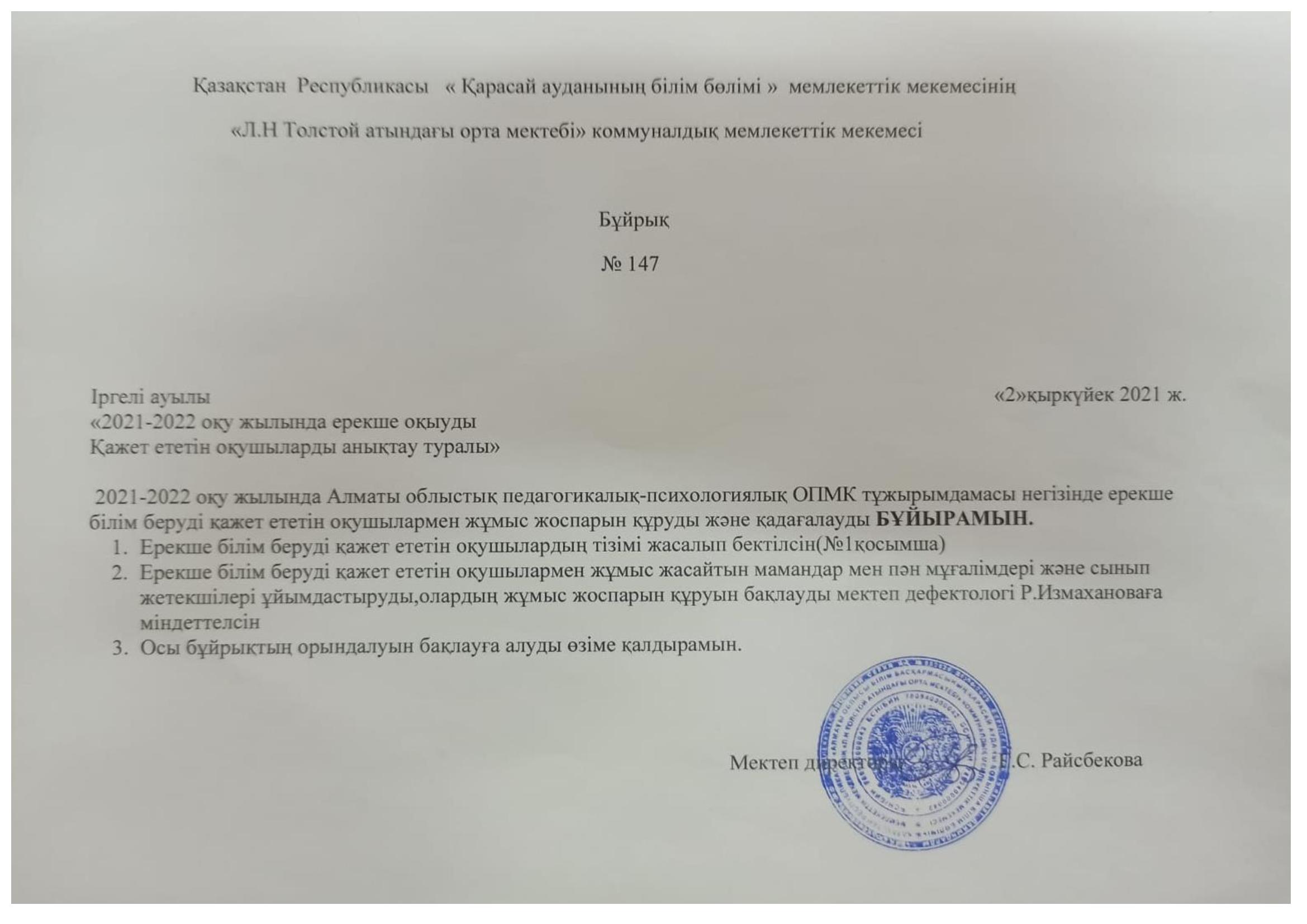 02 сентябрь 2021 0 1 2 3 4 5 Инклюзивті оқыту бағдарламасы бойынша білім алатын оқушылар тізімін анықтау. 2021-2022 оқу жылы