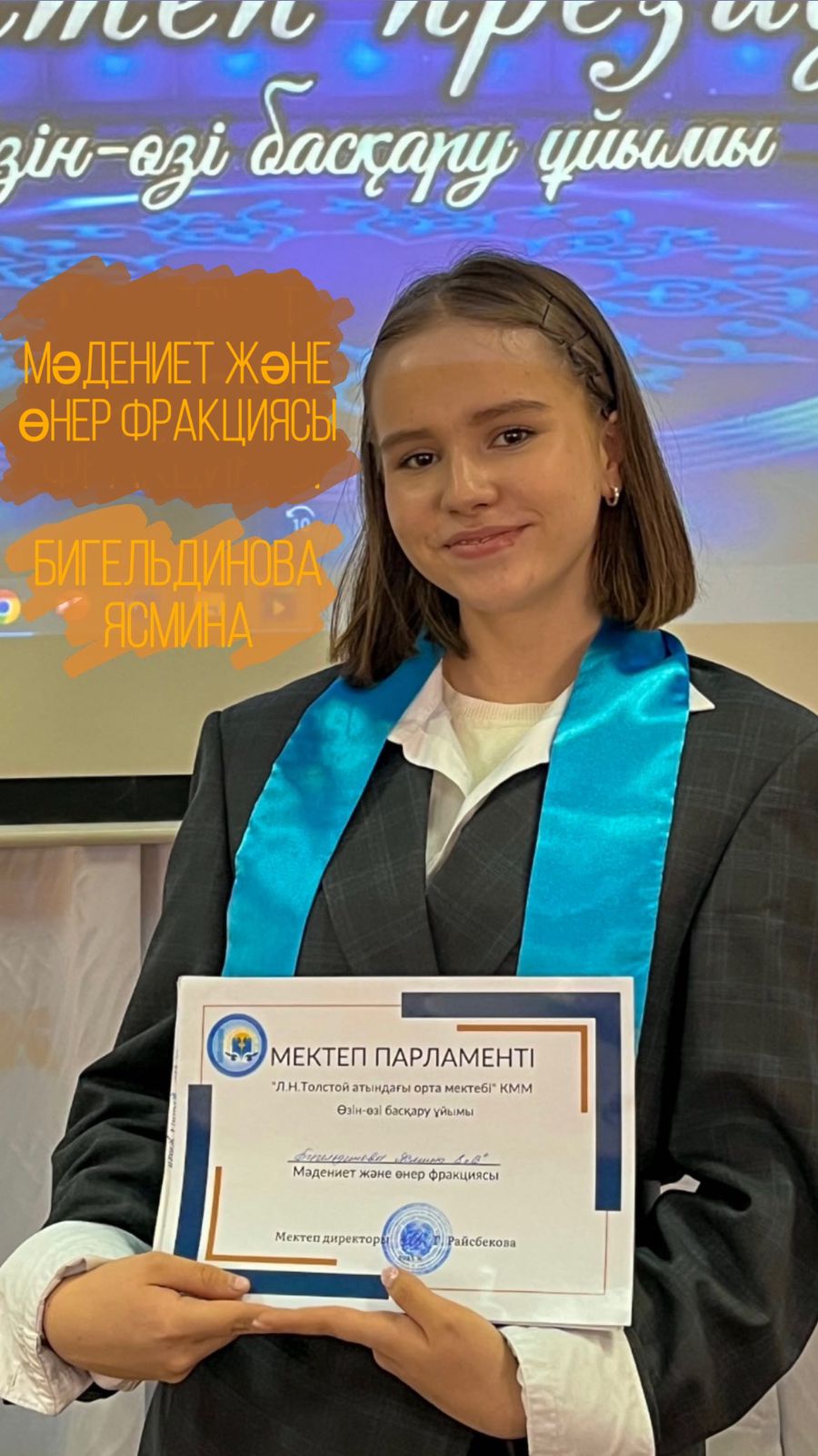 9 Бигельдинова Ясмина 8 «В» сынып Мәдениет және өнер фракциясы болып тағайындалды.